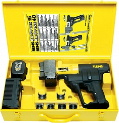 - REMS Акс-Пресс 40 Li-Ion Сет. Аккумуляторный, аксиальный пресс для изготовления соединений с натяжной и запресовавающей муфтой Ø 12 – 32 мм. Электрогидравлический привод с аккумуляторным двигателем, 14,4 В, 380 Вт, планетарным редуктором, эксцентриковым поршневым насосом и компактной мощной гидравлической системой. Переключатель безопасности. Встроенный рабочий светодиодный светильник. Аккумулятор Li-Ion 14,4 В, 3,2 Aч, быстрозарядное устройство Li-Ion/Ni-Cd 230 Вт, 50 – 60 Гц, 65 Вт. Пресс-головки REMS соответствуют требованиям каждой системы с натяжной гильзой. В прочном стальном чемодане