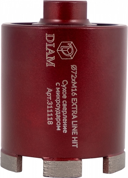Алмазная коронка с пылеудалением для сухого сверления с микроударом подрозетников Diam Extra Line Hit 72 мм (Диам Экстра Лайн Хит 72 мм) – алмазное сегментное кольцевое сверло для подрозетников для сухого сверления бетона, железобетона (армированного бетона, арматура толщиной до 10 мм), бетонных строительных блоков, кирпича на сверлильных машинах с функцией микроудара без подачи воды. Применяется с использованием встроенного пылеотвода на сверлильной машине или с применением адаптера с пылеотводом, с последующим подключением к нему строительного пылесоса.