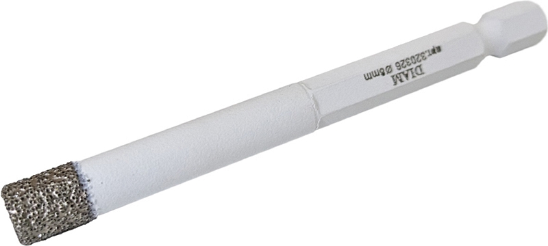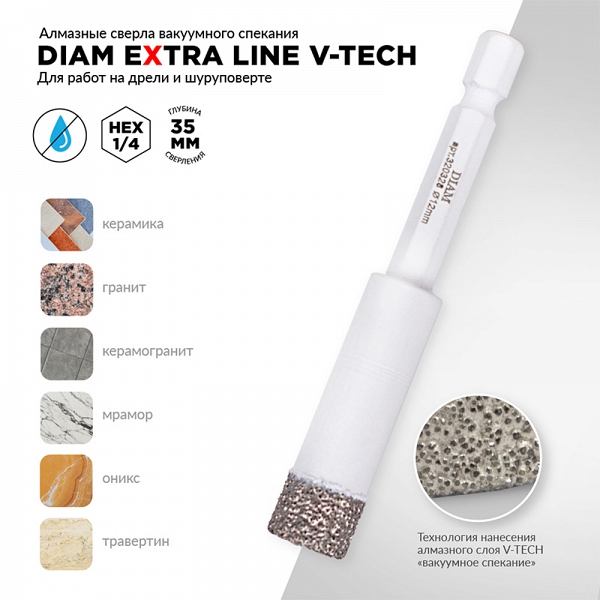 Алмазное сверло вакуумного спекания Diam Extra Line V-Tech HEX-E 1/4" 8 мм (Диам Экстра Лайн В-Теч Хекс-Е 1/4" 8 мм) предназначено для сверления отверстий Ø 8 мм, глубиной до 35 мм в керамике, граните, керамограните, мраморе, ониксе, травертине без водяного охлаждения при помощи шуруповерта или дрели.