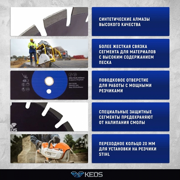 Преимущества диска алмазного сегментного по асфальту Keos Professional Asphalt 350 мм: