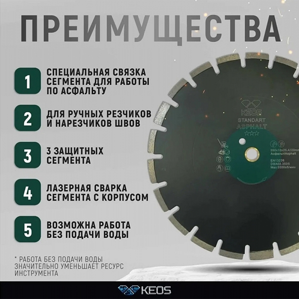 Преимущества диска алмазного сегментного по асфальту Keos Standart Asphalt 500 мм: