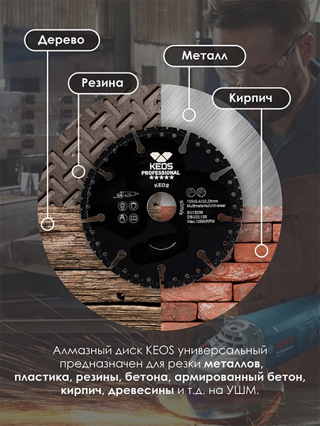 Диск алмазный универсальный Keos Professional 125 мм (Кеос Профессионал 125 мм) предназначен для резки металлов, пластика, резины, бетона, армированного бетона (железобетона), кирпича, древесины и т.д. ушм (болгарками), штроборезами, системами резки крупноформатной плитки, как с подачей воды, так и всухую. Подходит для универсального использования, аварийно-спасательных работ и многого другого.