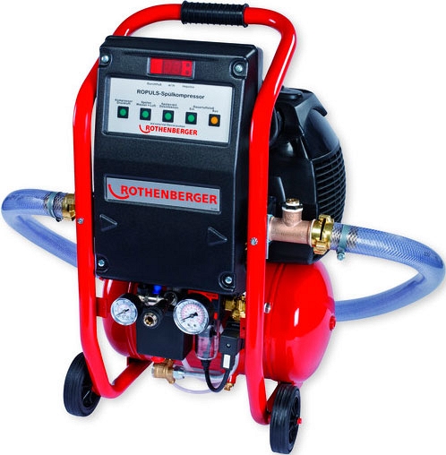Компрессор для промывки Rothenberger Ropuls (Ротенбергер Ропульс) предназначен для промывки пульсирующей водно-воздушной смесью водопроводов, в том числе с питьевой водой, систем отопления (подогрева) пола, водонагревателей, радиаторов и т.д., а также прочистки химическими веществами.
