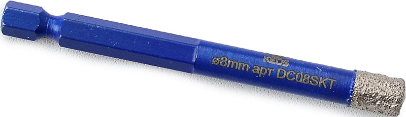 Коронка алмазная по керамограниту Keos Professional Vacuum Brazed 1/4" HEX 8 мм (Кеос Профессионал Вакуум Брейзед 1/4" ХЕКС 8 мм) – корончатое сверло для сверления отверстий Ø 8 мм в керамической плитке, керамограните, граните, мраморе и других видах камня, как на сухую, так и с охлаждающими жидкостями, с использованием сетевых электрических и аккумуляторных дрелей и шуруповертов.