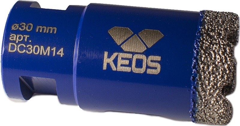 Коронка алмазная по керамограниту Keos Professional Vacuum Brazed M14 30 мм (Кеос Профессионал Вакуум Брейзед М14 30 мм) – корончатое сверло для сверления отверстий Ø 30 мм в керамической плитке, керамограните, граните, мраморе и других видах камня, как на сухую, так и с охлаждающими жидкостями, с использованием сетевых электрических и аккумуляторных УШМ.
