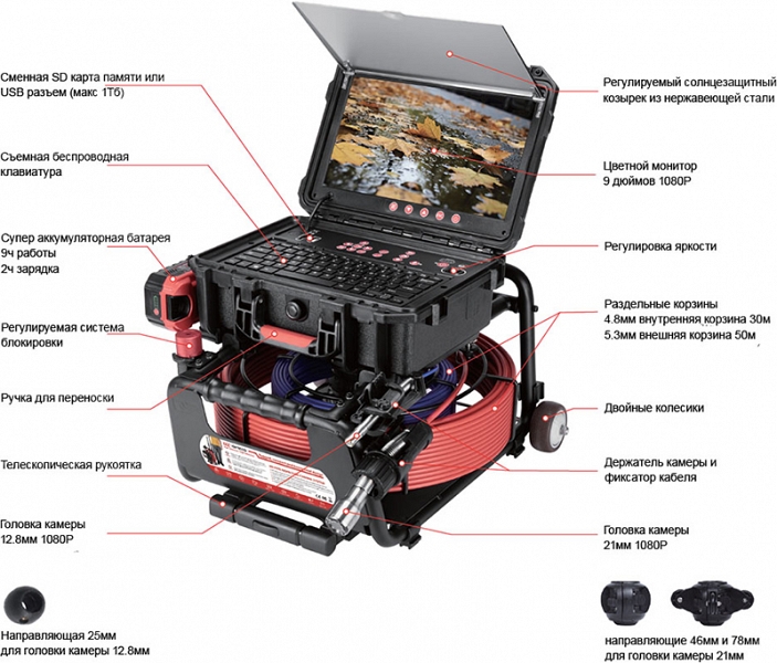 - Головка камеры Ø 21 × 45 мм и проталкиваемый кабель Ø 5,3 мм × 50 м из стекловолокна со счетчиком длины и системой торможения, подходящие для труб Ø 50 – 125 мм, длиной до 50 м