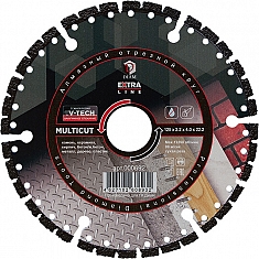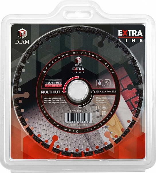 Универсальный алмазный круг Diam Extra Line V-Tech Multicut 125 мм (Диам Экстра Лайн В-Теч Мультикат 125 мм) – специальный алмазный отрезной диск для сухой резки широкого спектра материалов, таких, как: камень, керамика, кирпич, бетон, железобетон, металл, дерево, пластик и многих других.