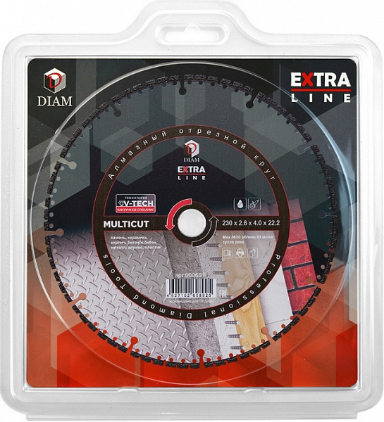 Универсальный алмазный круг Diam Extra Line V-Tech Multicut 230 мм (Диам Экстра Лайн В-Теч Мультикат 230 мм) – специальный алмазный отрезной диск для сухой резки широкого спектра материалов, таких, как: камень, керамика, кирпич, бетон, железобетон, металл, дерево, пластик и многих других.