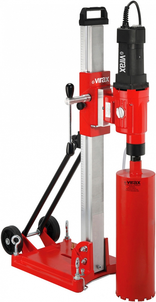 Установка алмазного бурения Virax V 250 (Виракс В 250) предназначена для влажного алмазного сверления отверстий под углом 0° – 45° в бетоне и железобетоне, абразивных материалах, кирпичной кладке, облицовочных материалах алмазными коронками Ø 25 – 250 мм.